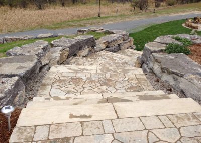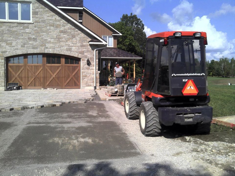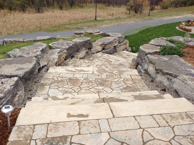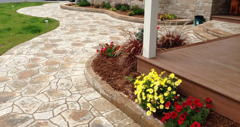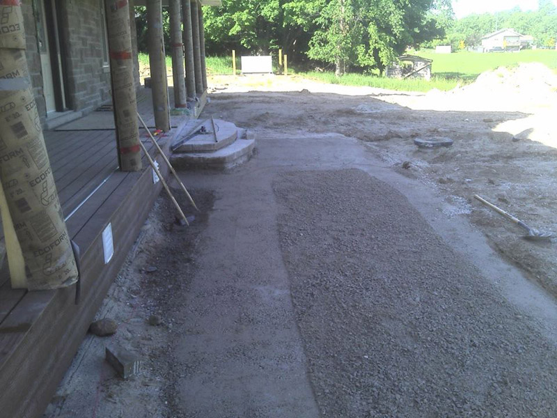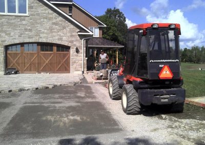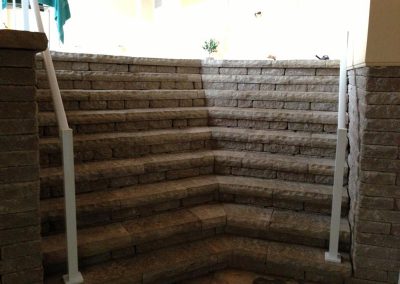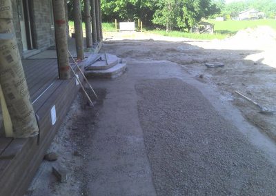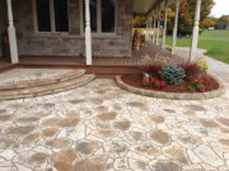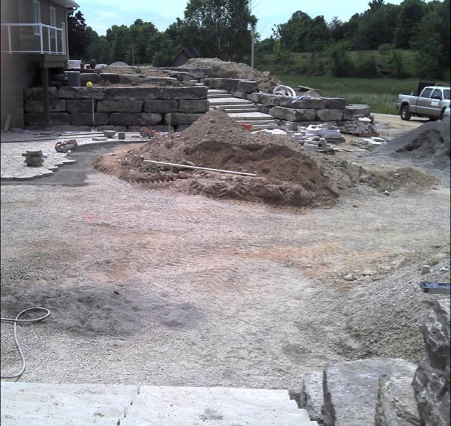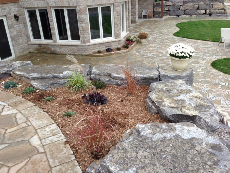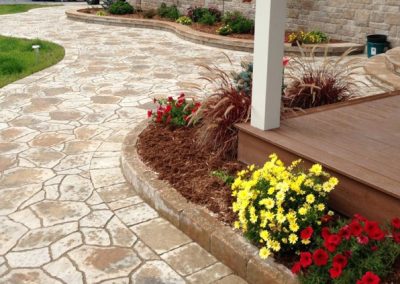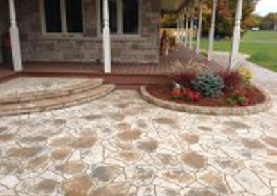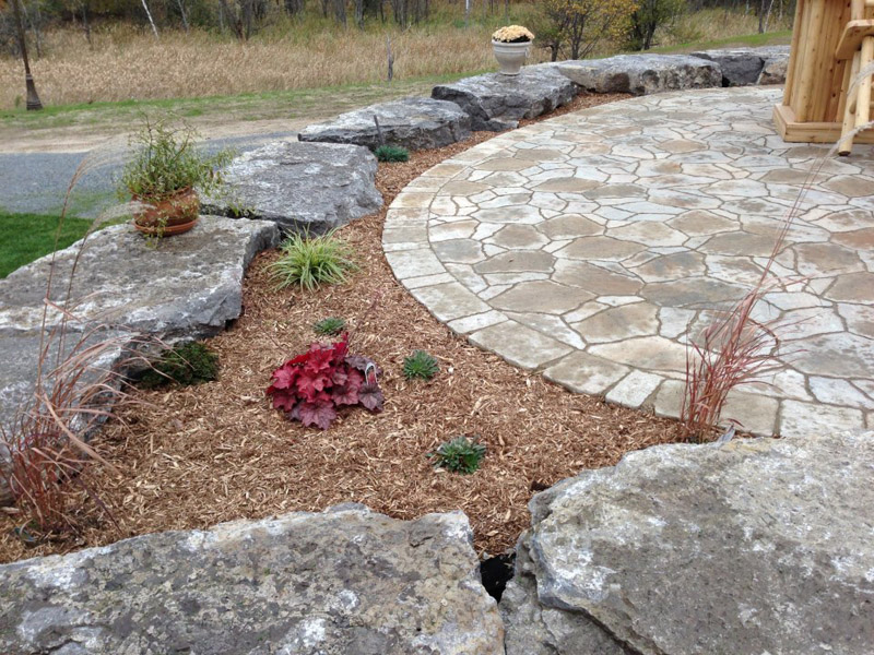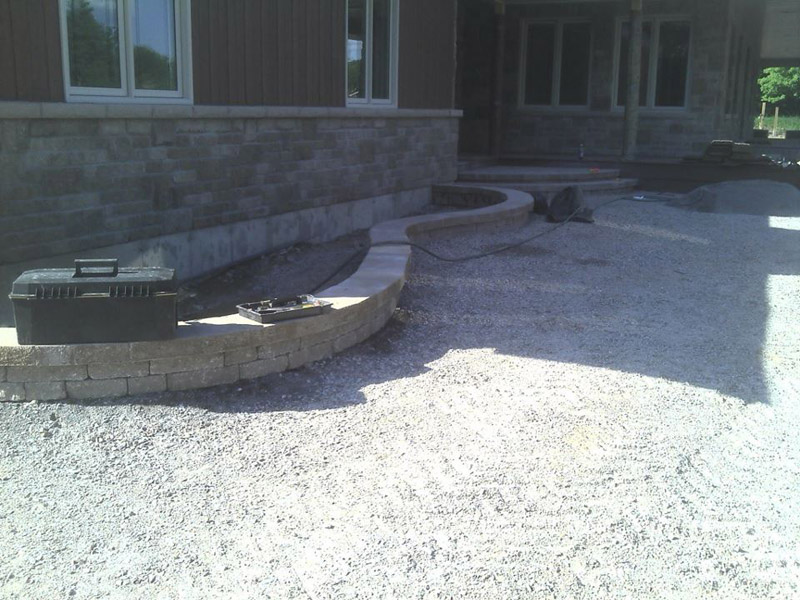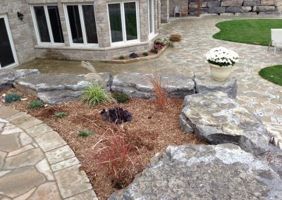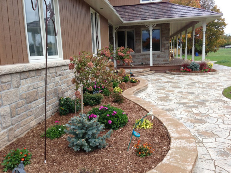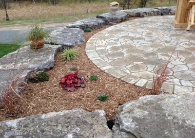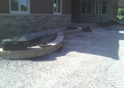 The front entrance is completed by a flowing walkway in Mega Arbel pavers to tie the front and back yards together. A low profile Celtik wall retaining wall was constructed to define the garden bed area and add dimension to the front of the home. The garden design was again chosen to bring some height changes and dimension to the front of the home while at the same time meeting the needs of the homeowner and the climate of Lanark County.