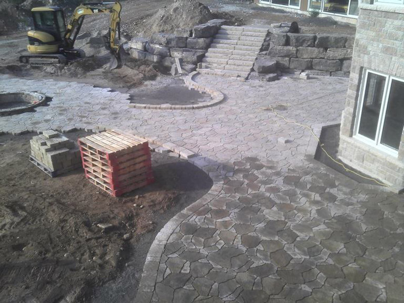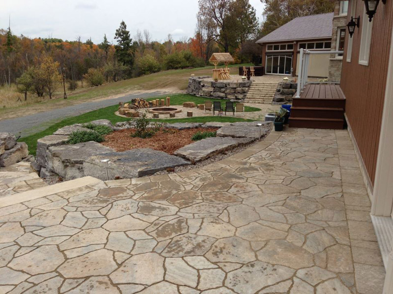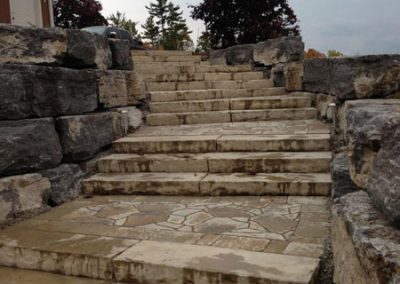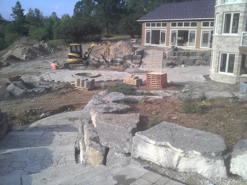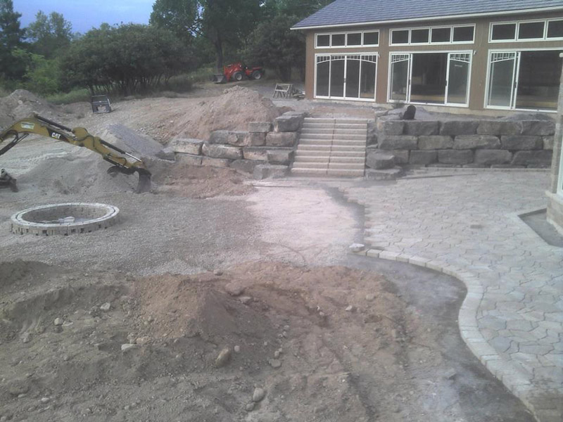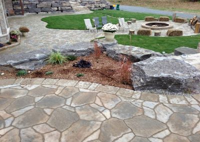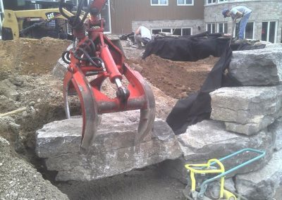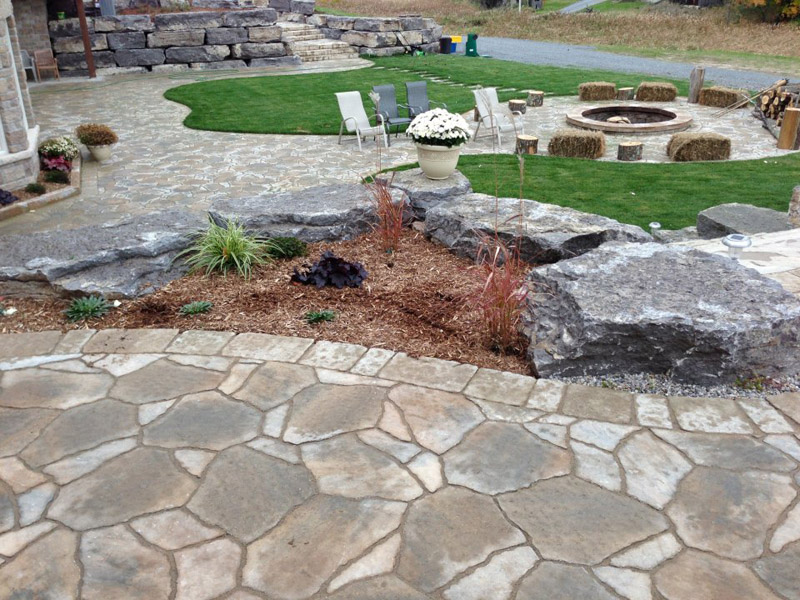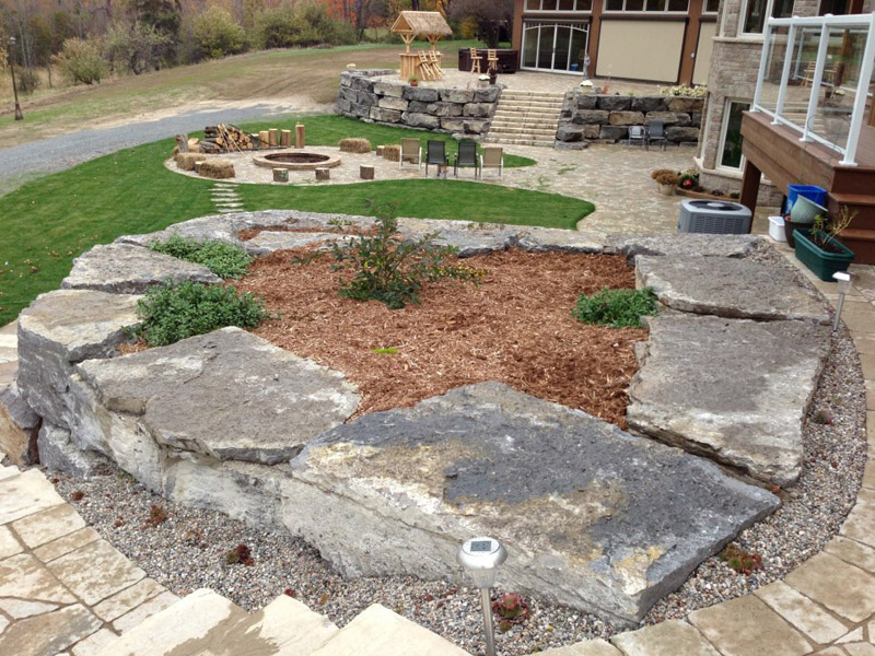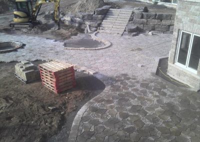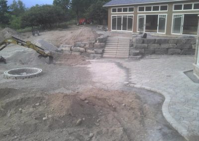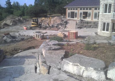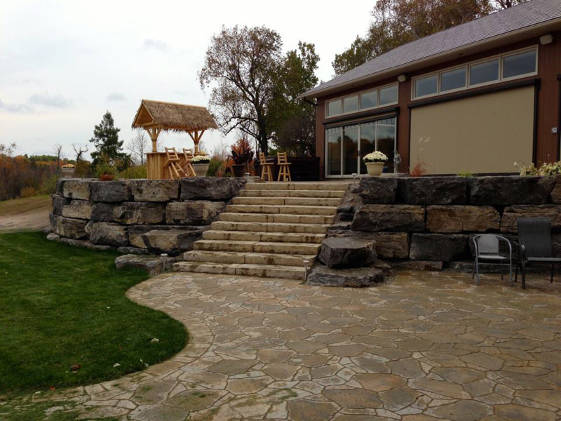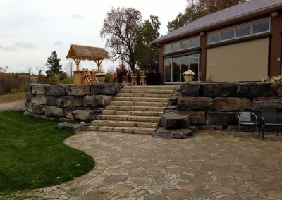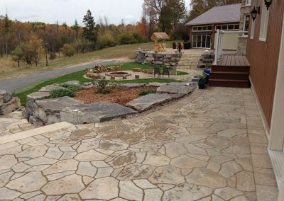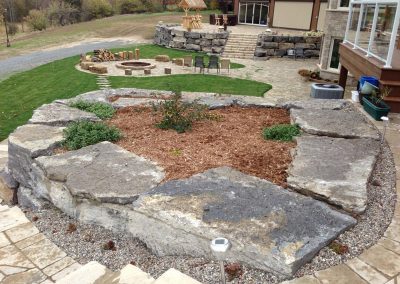 This is a blend of 3 major projects: interlock, gardening and the armour stone retaining wall. A fire pit was a must for this design as the customers are lovers of the outdoors. Steps and a retaining wall were created inside the house for the pool area. Hemmingford Steps used with a natural stone retaining walls transition the customer from fire pit to the tiki bar and outside the pool deck.