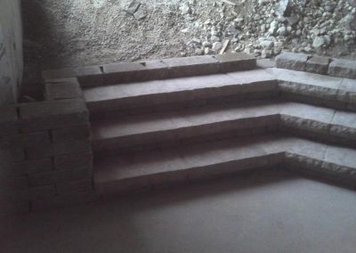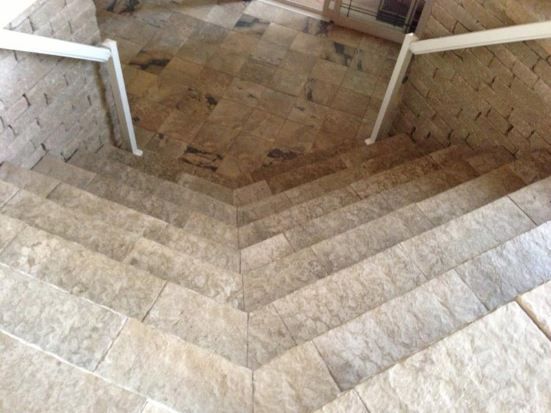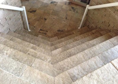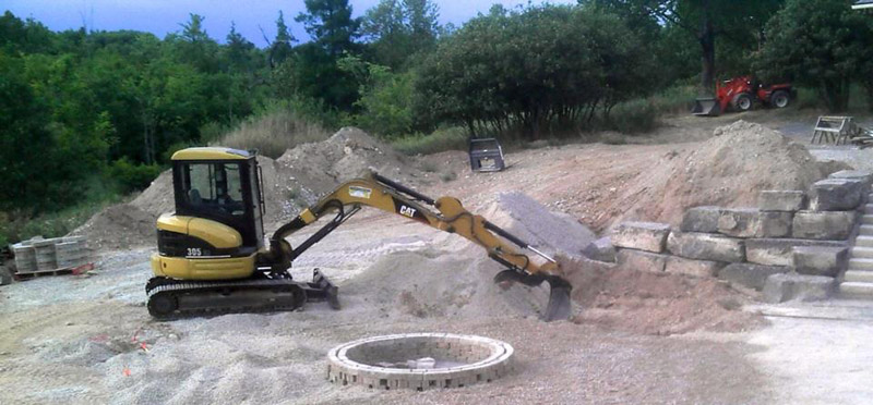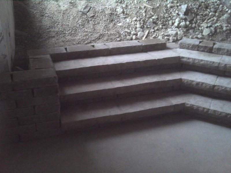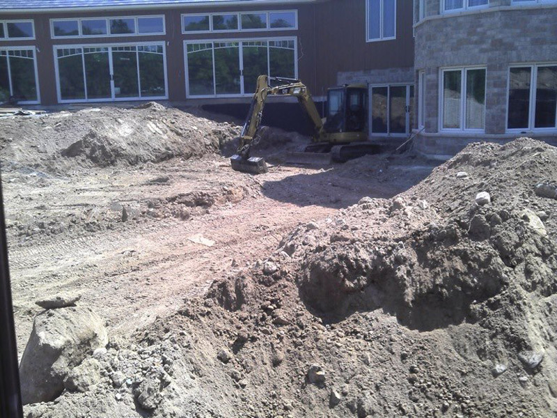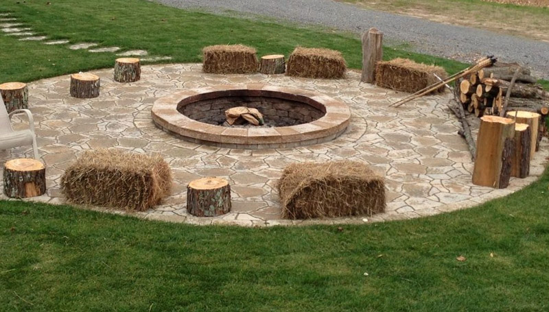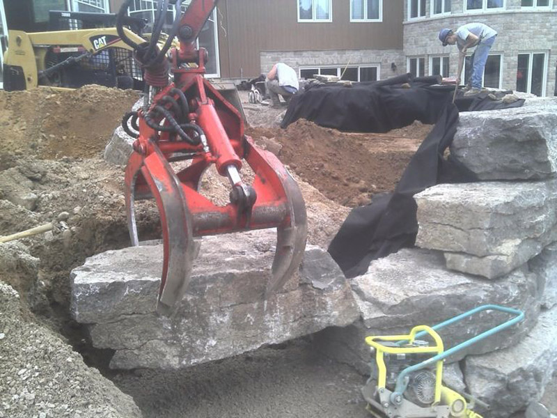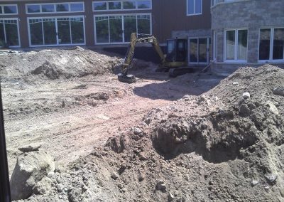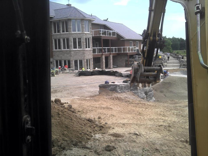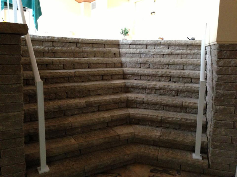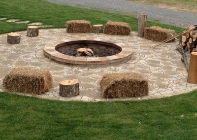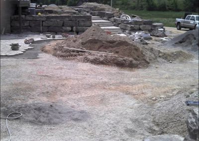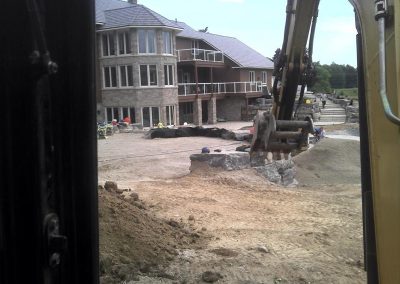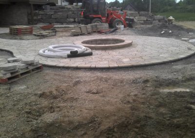 This is a blend of 3 major projects: interlock, gardening and the armour stone retaining wall. A fire pit was a must for this design as the customers are lovers of the outdoors. Steps and a retaining wall were created inside the house for the pool area. Hemmingford Steps used with a natural stone retaining walls transition the customer from fire pit to the tiki bar and outside the pool deck.